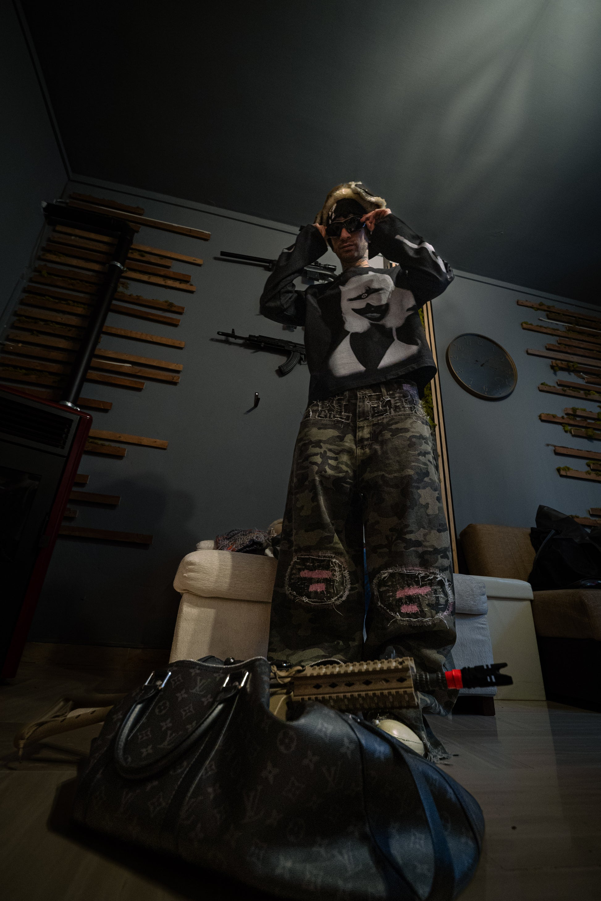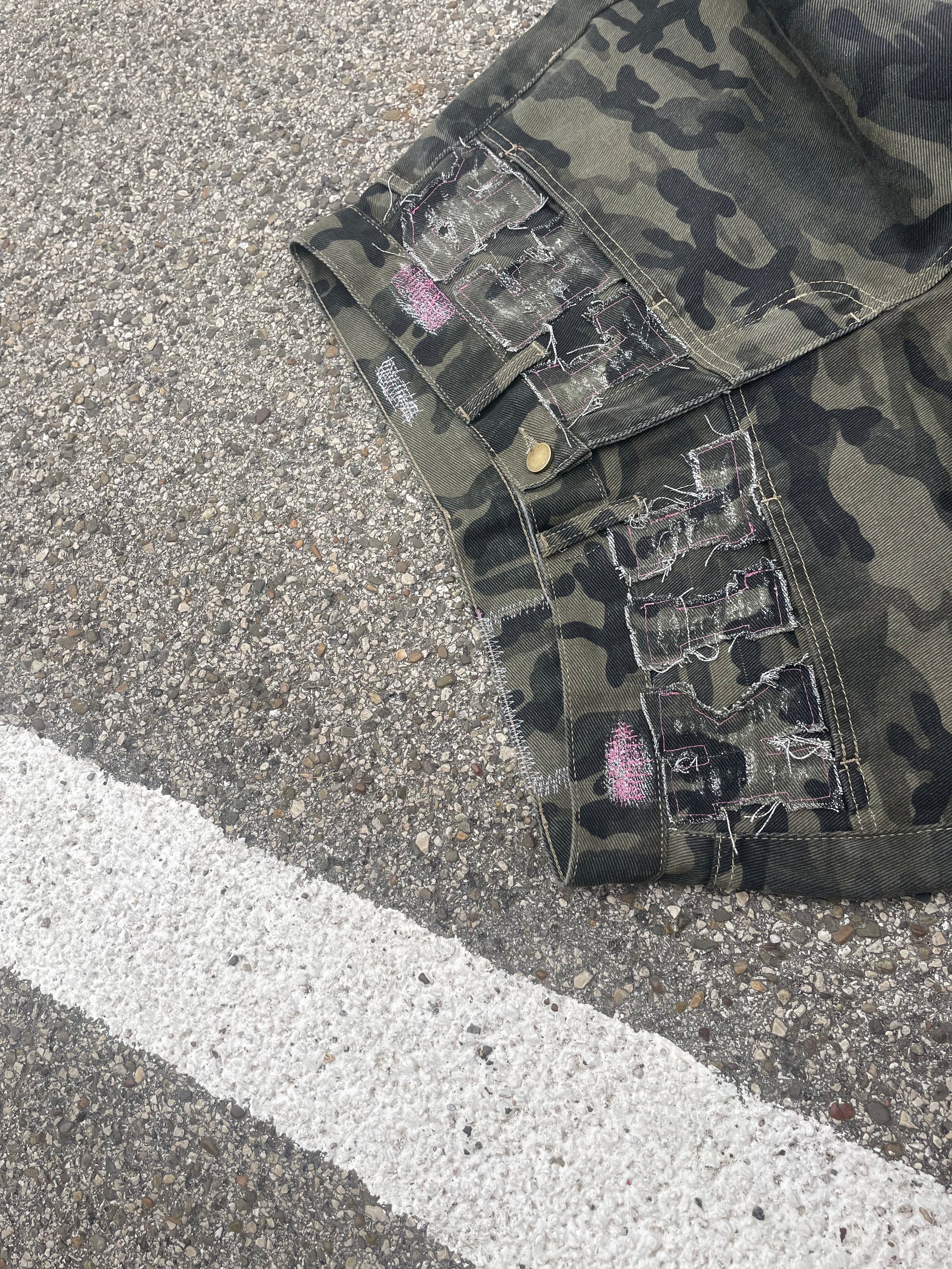 Jeans camo con patch killer in tessuto + ricami